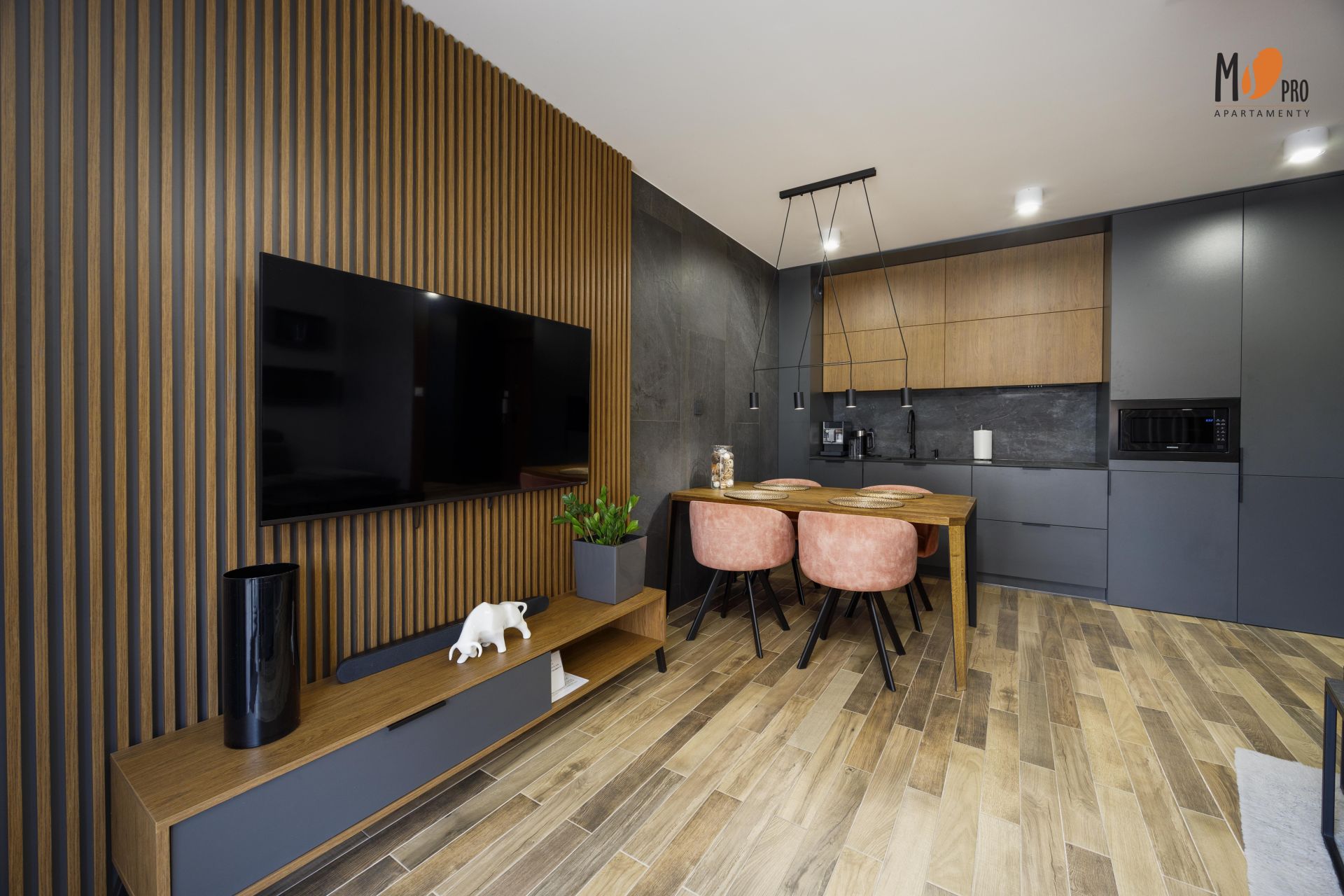 Salon z dużym i wygodnym narożnikiem, stylowym wykończeniem oraz indywidualnym wyjściem na balkon w połączeniu z ze świetnie wyposażonym aneksem kuchennym oraz jadalnią spełni oczekiwania najbardziej wymagających gości.